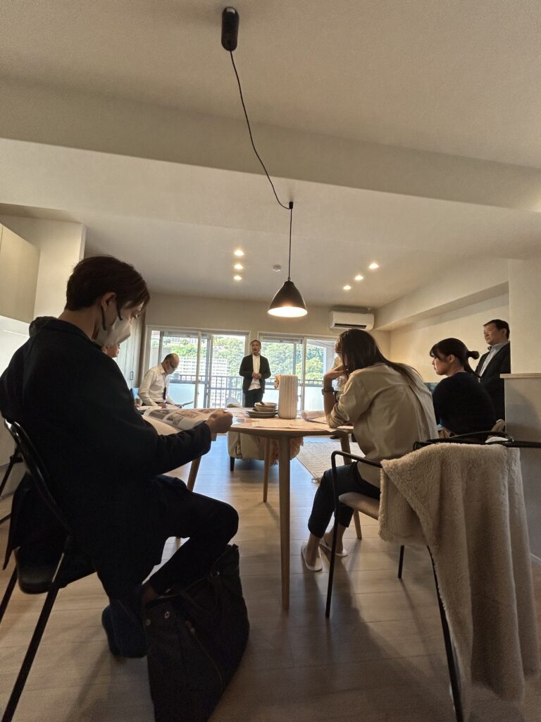 このお部屋は、当社が手がけた最新のマンションリノベーション事例のひとつでもあり、「鹿児島市でどのような住まいづくりが求められているか」を実際の空間を体験しながら共有いただける場となりました。