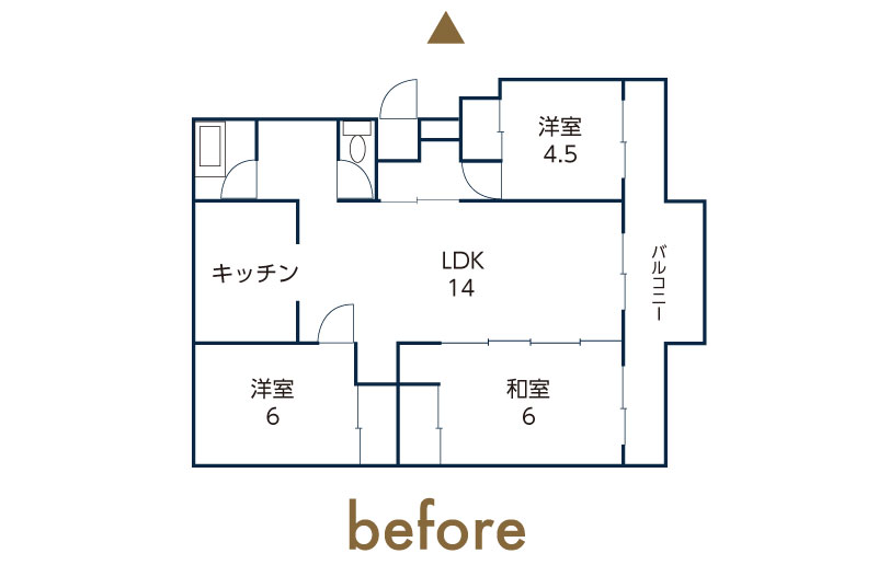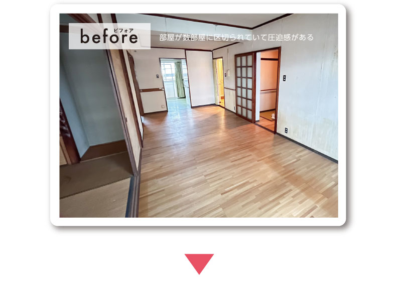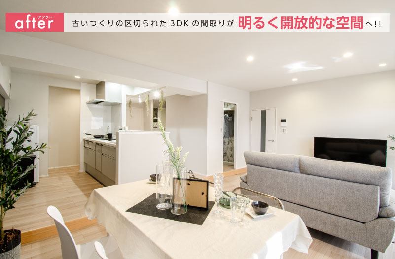 壁をなくして、南向きのバルコニーから光が入るひとつながりの大空間に。ダイニング・リビングがゆるやかにつながり、家族が自然と集まる明るいリビングになりました。