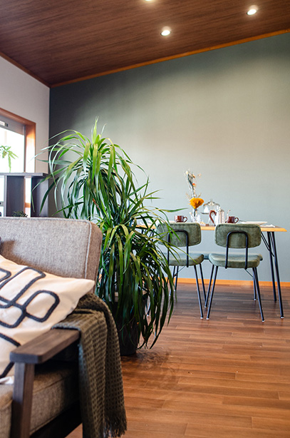 住まい全体は、落ち着いた色合いと素材感を大切にしながら、どこか懐かしさと上質さを感じさせる空間に仕上げ、家族が自然体でくつろげる雰囲気を演出しています。